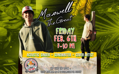 Join us as we welcome local acoustic singer/ songwriter Maxwell the Great for another appearance on the Tap That Tiny Stage! Super fun beachy, Sublime, Jason Mraz type vibe. Come welcome him back and show him all the Tap That Family love!