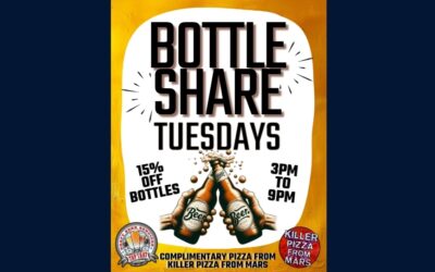 Join us every Tuesday for our in-house bottle share! Grab a bottle from the cooler, and share with the group to get 15% off your bottles! Great way to try new beers and meet new friends! Complimentary pizza is provided by our friends at Killer Pizza from Mars-
