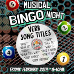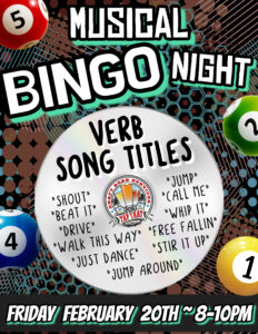 Join us for Musical BINGO night! This month’s Theme is VERB Song titles. Free to play and a chance to win beer SWAG or Tap That Gift Cards! Come out and play with us! BINGO cards and Daubers Provided. Always a fun time with the Tap That Crew in the Clubhouse!