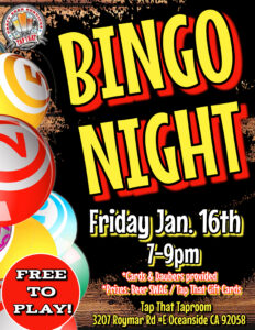 Join us for BINGO night! Free to play and a chance to win beer SWAG or Tap That Gift Cards! Come out and play with us! BINGO cards and Daubers Provided. Always a fun time with the Tap That Crew in the Clubhouse!
