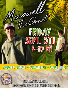 Join us as we welcome local acoustic singer/ songwriter Maxwell the Great for his first appearance on the Tap That Tiny Stage! Super fun beachy, Sublime type vibe. Come welcome him and show him all the Tap That Family love!