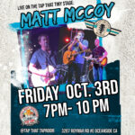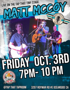 Join us on Friday October 3rd as we welcome Matt McCoy and friends to the Tap That Tiny Stage! Local Osider, Matt stays busy playing all over Oceanside and surrounding areas. The Multi-talented musician sings, plays guitar, and harmonica. Come show him lots of love as he makes his way back to the taproom for another Friday night of live music! Music from 7pm-10pm.