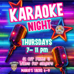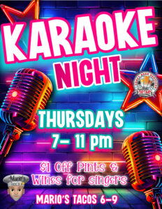 Join us from 7-11pm Thursdays to sing your hearts out! We have our resident DJ Strikeout in the house with 1,000’s of songs to choose from! Singers get $1 off pints during Karaoke. Mario’s Tacos on site to fill your bellies! **Please note that a in order to cover DJ services each week, a minimum $10 purchase per singer will be required to be added to the song list. Non-alcohol or cover charge options are available. Thank you for your understanding. **