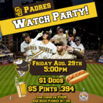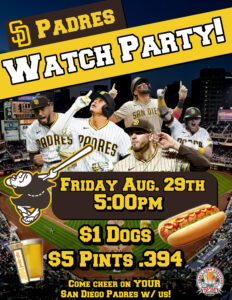 Come hang with us at our monthly Friday night Padres Game watch party with us on Friday August 29th @ 5 pm and help us cheer on YOUR San Diego PADRES with $1 Hot Dogs and $5 Pints of Alesmith .394.